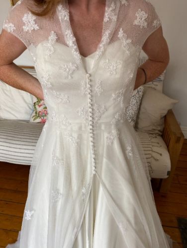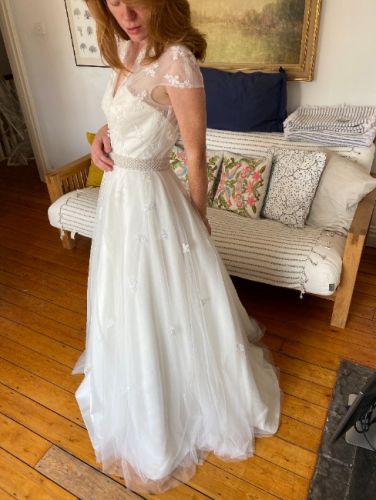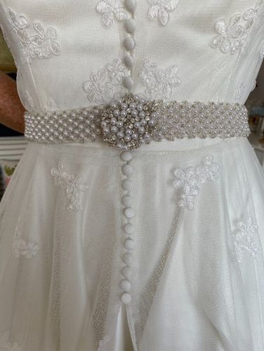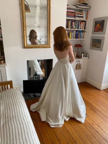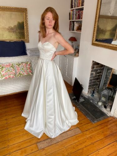 Strapless satin dress that can be worn with or without the lace ‘overcoat’ - with delicate buttons and beautifully detailed lace. Also included is the belt worth £50. I’m 5’7” and if I wear 2” heels it just brushes the ground.