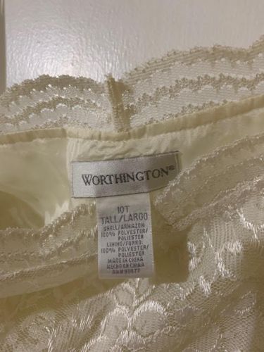 Ivory lace tea length gorgeous dress, simple elegance! Very fitted with empire waist, hidden side zipper for a slim figure. Fully lined, cap sleeves, flattering neckline. Size 10T (tall) purchased at JC Penney before they closed. EUC - perfect for a lovely, ceremony.