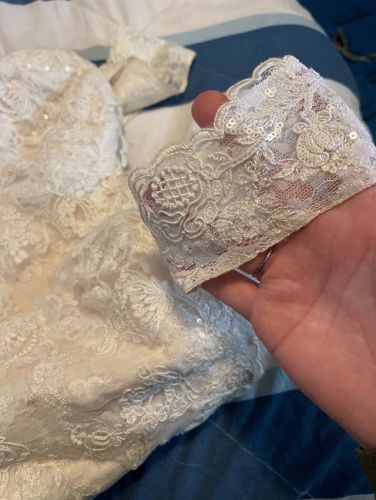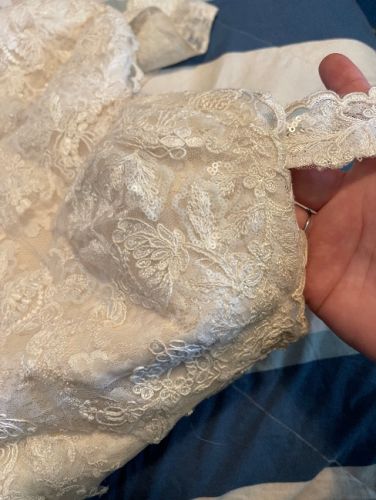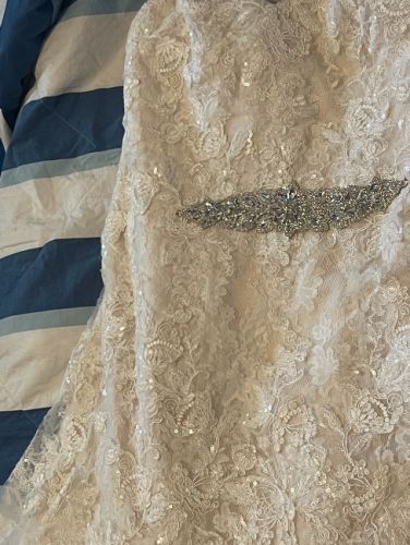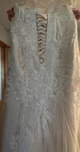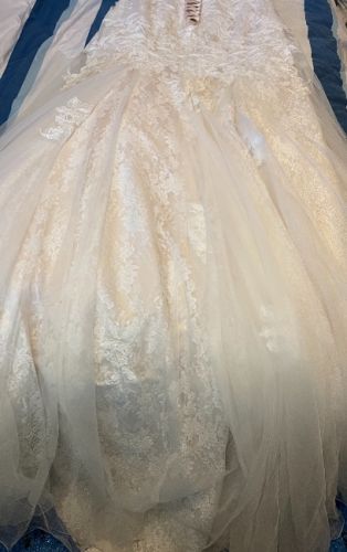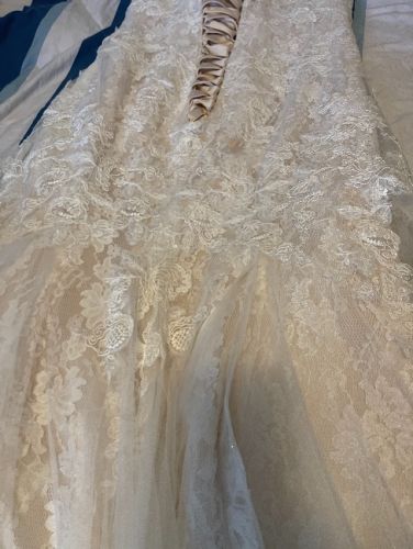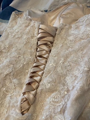 This dress is a size 12 or can go smaller as it does have corset back 4 layers under lace is champagne the sleeves are detachable and train bustles in back I absolutely loved this dress photos do not do it justice. on the front I had the belt put on instead of tieing which can be removed there is amazing support boning inside soo no bra extremely comfortable and supporting