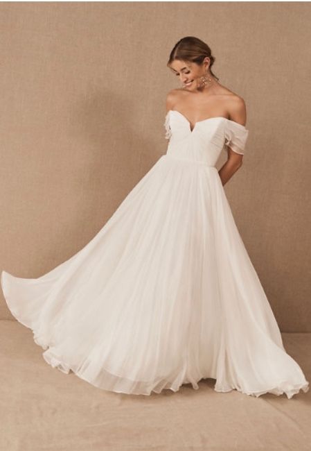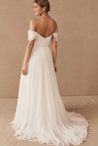With an off-the-shoulder neckline and breathtakingly airy skirt, this silk gown is a romantic bride’s dream come true. Gossamer sleeves add an ethereal quality that’ll make it seem as if you’re floating through the room.