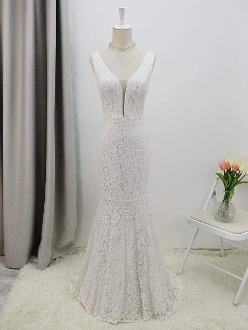 For those brides looking for a sexier silhouette, this simple lace mermaid wedding dress is the perfect choice. The deep v neck is subtle yet daring, and the figure-hugging skirt is sure to show off your curves to their best advantage. Toast to your future in this stunning simple wedding gown.