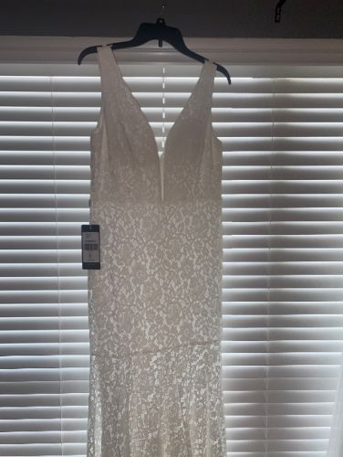 Styled in classic white lace, this is the perfect dress for an elegant, upscale wedding.