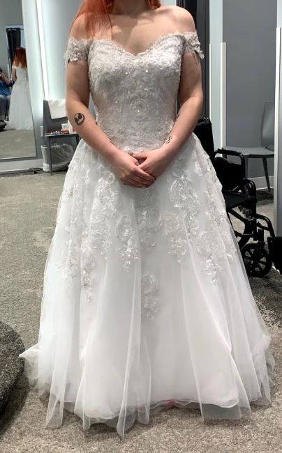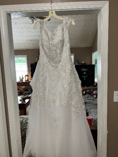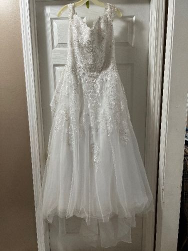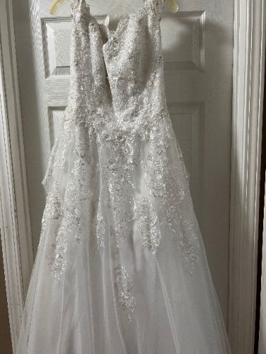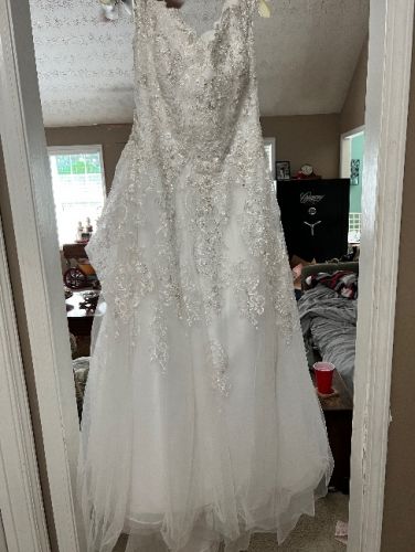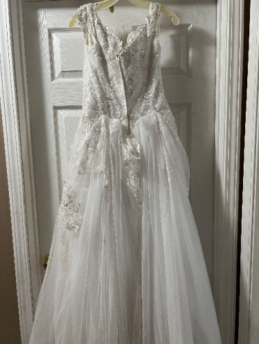 About a size 12 wedding dress worn once. Lightly dirty on bottom where it hits the floor, one stitch is broken on back of dress that pulls the train up into a bustle. Both can be easily fixed.