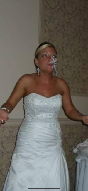 White strapless wedding dress, sequins on top and bushels on the side. Dress has been dry cleaned and persevered. Also comes with head piece. Size 10
