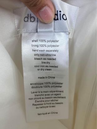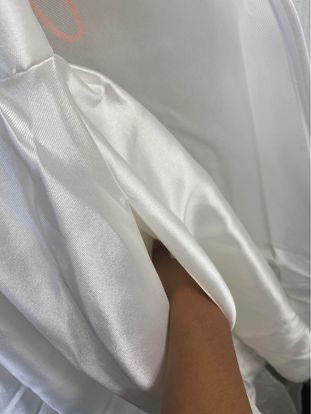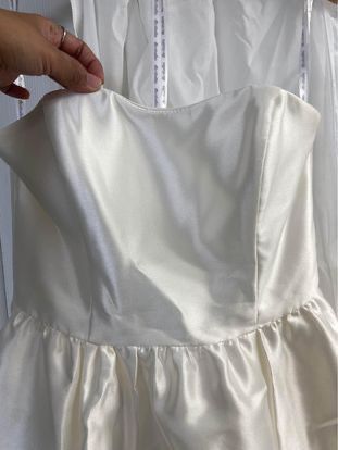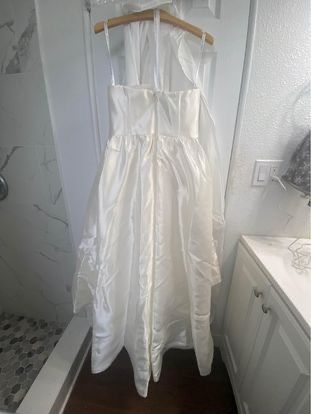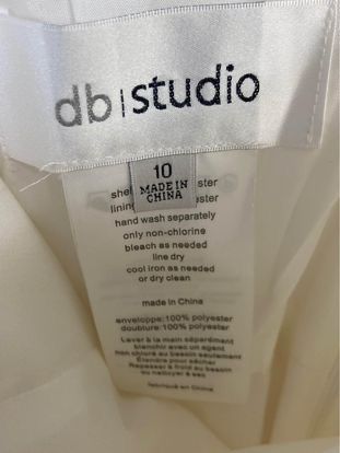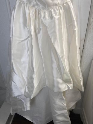 This white wedding dress is short in the front and long in the back. It has pockets and was only worn once, the day of my civil wedding and then immediately put back into storage after. It has wrinkles due to storage, but can be easily smoothed out with steamer.