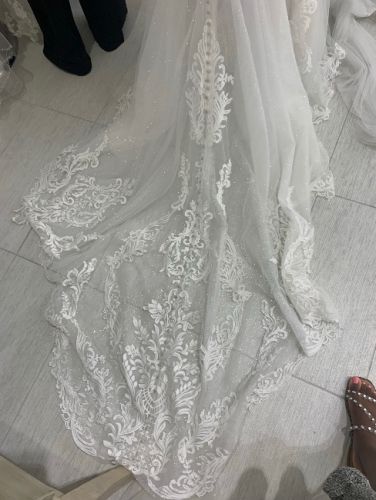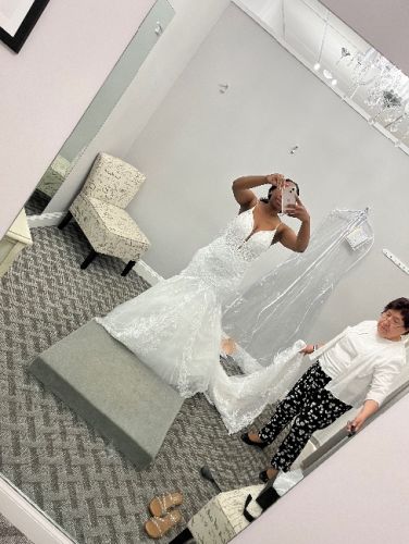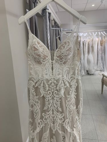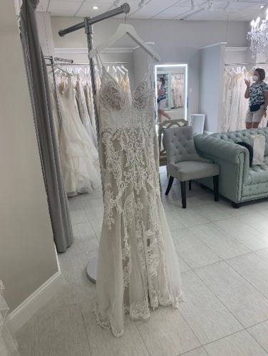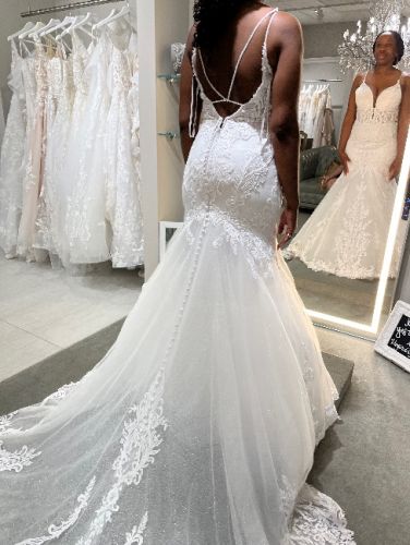 Form fitting mermaid style wedding dress with beaded straps and cross back.