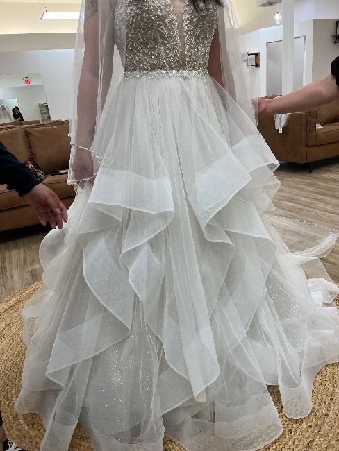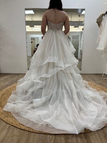 Never been used or altered wedding dress. At first I thought this dress was the one due to an emotional connection but later on realizing it wasn’t the one. Unfortunately I’m stuck with a dress I don’t feel connected to and would like to sell it full price or even get an offer for the dress. The designer of this dress is Janine, The sheer corset bodice dazzles with intricate beading and a sultry center plunge detail that leads to gorgeous triple beaded straps. The glimmering glitter tulle skirt is fabulously flounced with horsehair edging to define each layer for a textured and dramatic look. Shown in Ivory/Rosé/Honey.