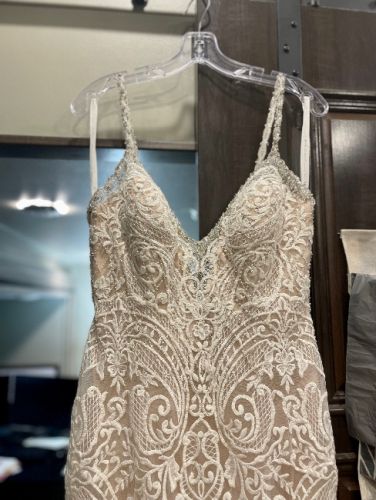 This dress is absolutely a show stopper with lots of gorgeous beading, lace appliqués with delicate beading a sequins for extra sparkle, fit and flair silhouette, low illusion back with zipper covered with buttons. This dress is brand new still with tags. This dress is in absolute perfect condition. It was not a sample dress. I ordered it and it is too small for me. I am happy to video chat or provide more pictures/videos at request.
