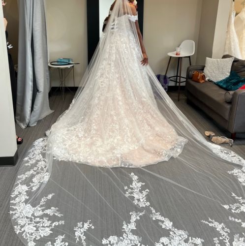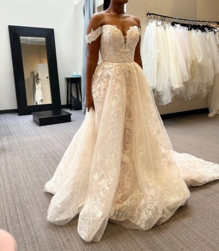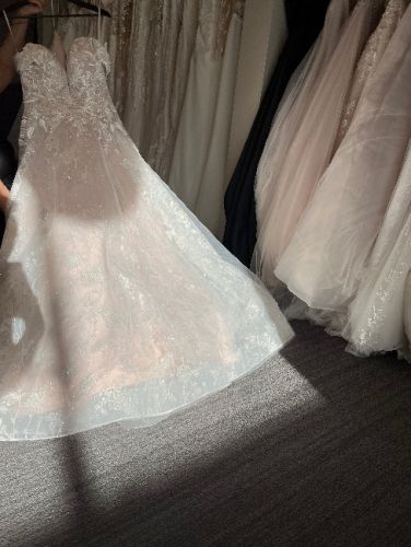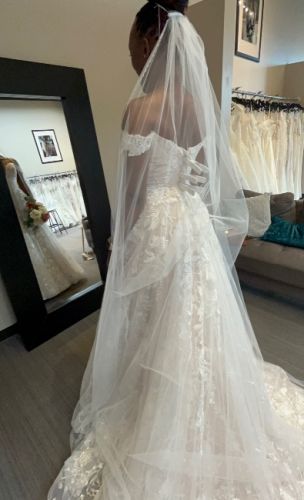 Worn once at my wedding that was indoor. It’s between size 8-10