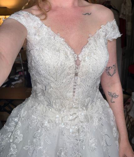 7 button bustle, off the shoulder, a line, sparkly.