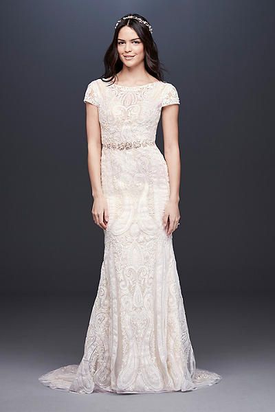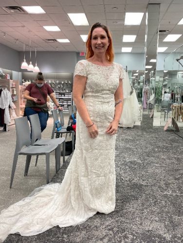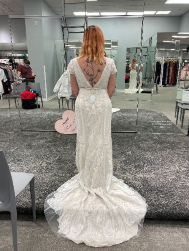 Size 10 champagne colored lace dress with bustle. Has not been dry cleaned. No stains. Open back