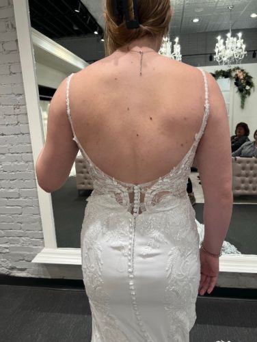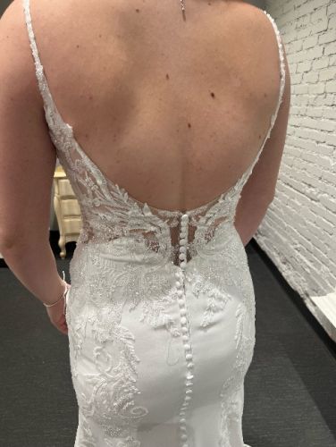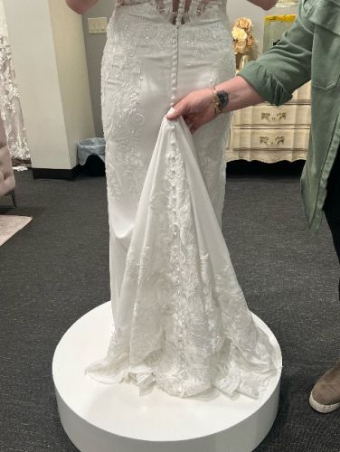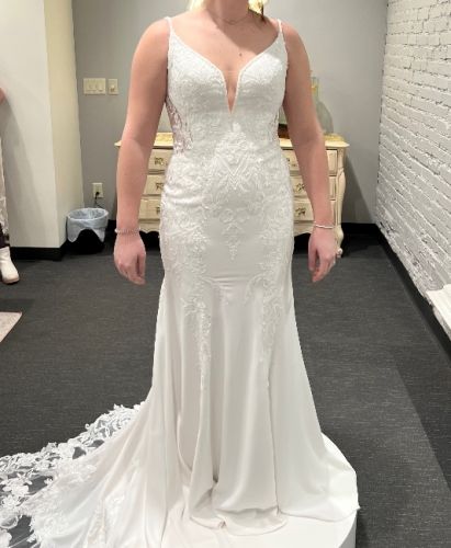 Purchased February of 2023 & wedding got called off never been worn. This dress has been created by a private label designer. Size 12, Fit-n-Flare, Ivory Crepe wedding dress with a long train with crepe buttons trailing all the way down to the hem! With a V-neck, plunging neckline, beaded straps, and low cut back accompanied by illusion netting under the armpits. This dress has beautiful beaded lace throughout the whole garment for the finishing look!
