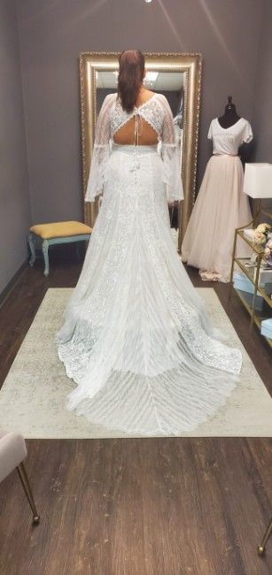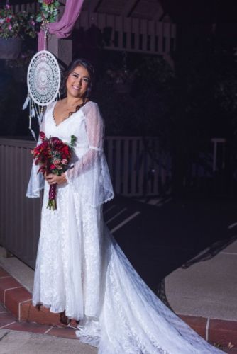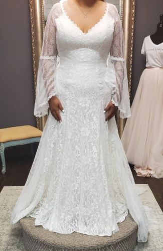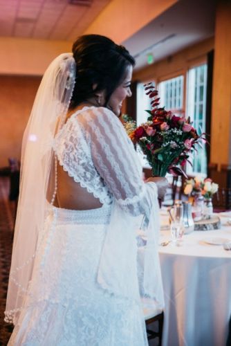 This dress was a dream come true, absolutely stunning! I've had so many compliments on this dress, it's so unique and the lace is so elegant. It was extremely comfortable to wear for the entire wedding and reception. It's so hard to part with it, it took me a year to post it. It's been altered to have a bustle in the back to put up the train for the reception.