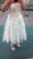 Brand new Davids Bridal gown. Tags still attached to the dress. Originally paid $399.99. Never worn excpet when tried on. Would be a great dress for a destination wedding or a reception dress. It is a beautiful dress and when I saw it I knew I had to have it. Beautiful sash that goes around the waste with attached flower.
