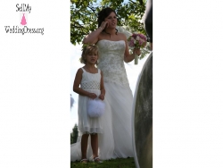 Original price was over $1,000, but asking $500 (price is slightly negotiable). This dress was worn for about an hour total for the ceremony & photos and then professionally dricleaned. I am normally a size 8, but as wedding dress sizes run small this fit like a glove with no altering. The description is as follows.