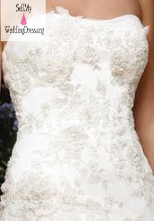 Bodice has beaded lace appliques accented with Swarovski crystals and silver beadwork on Sheer Organza over Silky Satin lining, with a strapless soft sweetheart neckline. Skirt is Sheer Organza with an asymmetrical waistline and a modified a-line silhouette.