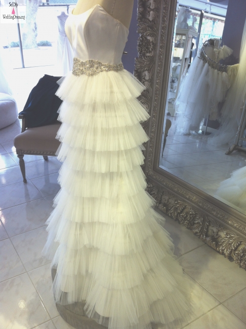This wedding gown is from the 2012 Romeo and Juliet collection. Is ist ruly spectacular. Soft irvory silk satin strapless top with a scoopneck, incredible embroidered belt at the natural waist covered in swarovski crystals and light ivory pearls, layers of silk tulle. Slight train to give a very high fashion editorial look. Chick and classic gown.