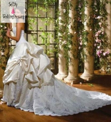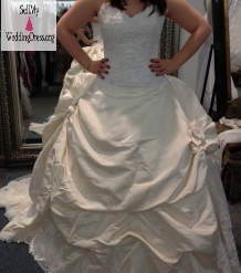 Wore Once! Absolutely gorgeous dress made to fit a princess! Fits very well throughout the body. 100 Pure Silk. Sweetheart neckline and a zip back with buttons. The cathedral length train is delicately beaded with lace and embellished with Swarovski crystals. Bodice is lace with detailed beading all over. The dress also has a french bustle for the attached train. This is a GREAT deal on an excellent condition, Eve of Milady designer gown!