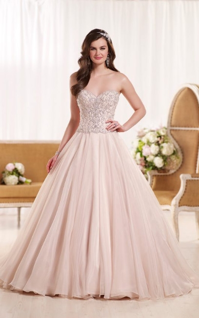 Elegant and feminine, this timeless Regency Organza designer ball gown wedding dress from the Essence of Australia bridal gown collection features a sweetheart neckline, beaded fitted bodice, and a whisper soft organza skirt and chapel train. Size 26 dress. The dress does have a bustle built into it that is easily created for the reception.