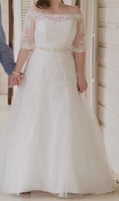 This dress captures a timeless elegance with a subtle trumpet silhouette, off the shoulder lace sleeves, and delicate floral designs. Slimming for all, including apple-shaped women like myself. This pricing includes the dress being professionally dry cleaned and treated. No alterations have been made, fits true to size.
