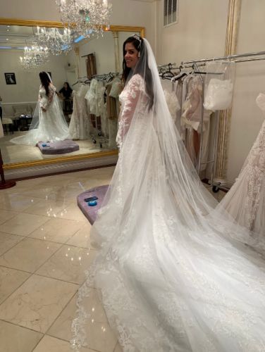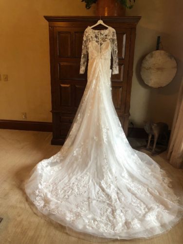 The custom changes include a longer train, Removable straps, a longer vail with more detailed lace, a lace bolero jacket with pearl buttons on the back-the jacket is also removable. This was made to give the option of two different looks on the wedding night. One with long sleeves and one without.