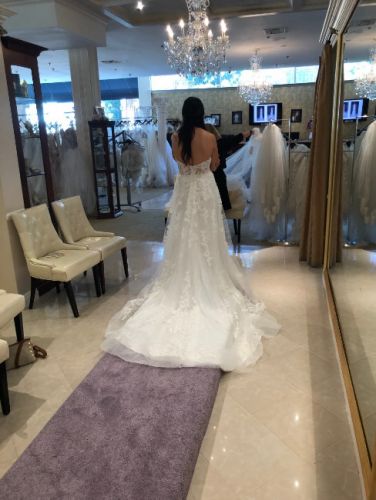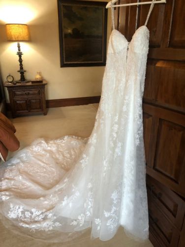 The dress has Laser cut floral chiffon lace with pearl beaded bodice, sheered back, crystal buttons, cathedral train, modified A-line skirt, illusion fit and flair skirt lining.