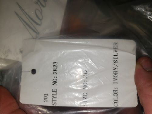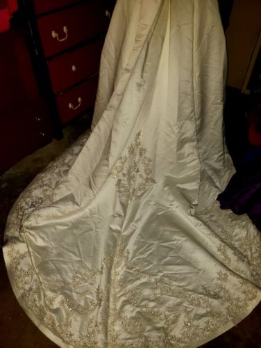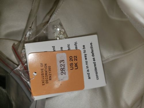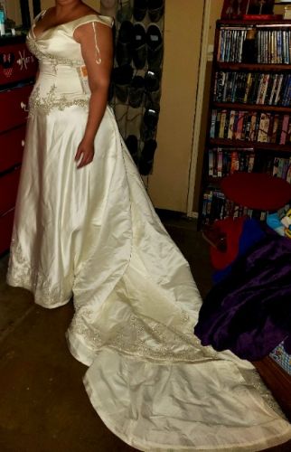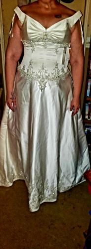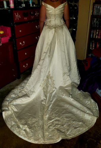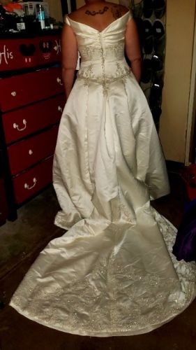 Beautiful wedding dress Ivory satin with intricate embellishments from the bodice down the train. Tags say size US 20 and UK 22. Another tag says style number 2823. Only has been worn for these pictures. Will make some lucky lady a beautiful bride one day.