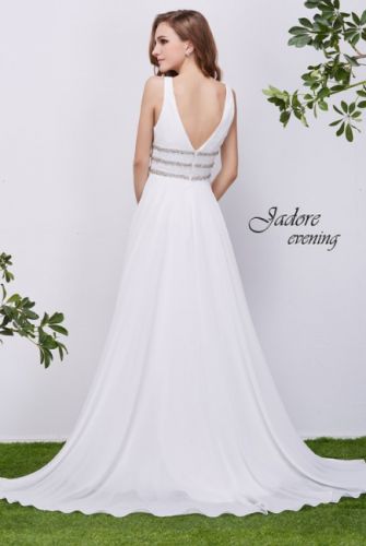 Sophisticated and sensual, this A-line chiffon gown by Jadore is perfect for a formal, red carpet, and evening affairs. It presents a shoulder strap fitted bodice framed with a sumptuous V-plunge on the front and deep V-back.