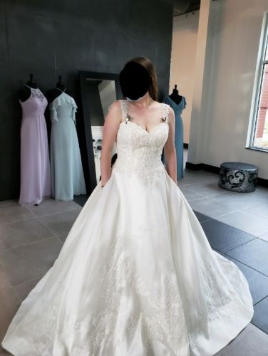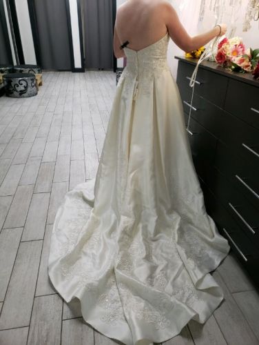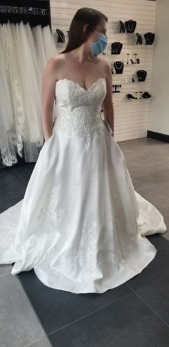 Never worn other than to try on. Decided on a different silhouette. I also purchased the matching sleeves/straps as pictured in photo 4 which were over $200. Planned to have them added when I went for alterations but never got there. Sleeves/straps can be purchased separately, just message me. Retail for the dress is over $1,400.....bought as a sample. Just trying to get back what I paid for it so I can afford the dress of my dreams.