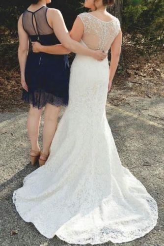 BRAND NEW, NEVER WORN! Figure flattering all over white lace trumpet gown with a Queen Ann neckline that has been adorned with glamorous silver and crystal beading. The back of the gown is accented with mesh and intricate beading. It has a zipper closure on the lower back and button closure on top with the mesh and beading. The soft flared skirt finishes with a chapel length train. No alterations have been made.