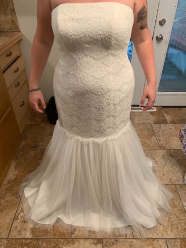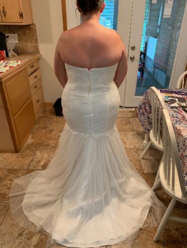 Size 16. I bought this dress in hopes I’d be able to wear it (I tried it on only twice). But we went a different route and I wore a sundress instead. I had the bottom hemmed (I’m 5’4 1/2”). The detailing is beautiful. Comes with a bust and a garment bag. Belt not included. Price includes shipping. ApplePay, Venmo, CashApp, or PayPal. Will take offers if you e mail. On my way up 247 at g mail (No spaces)