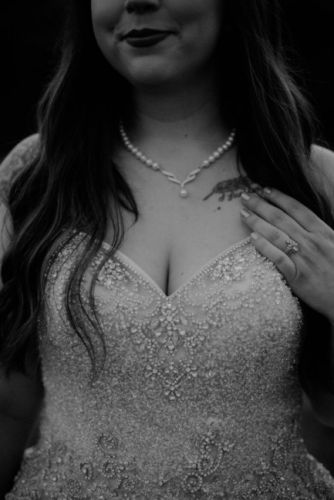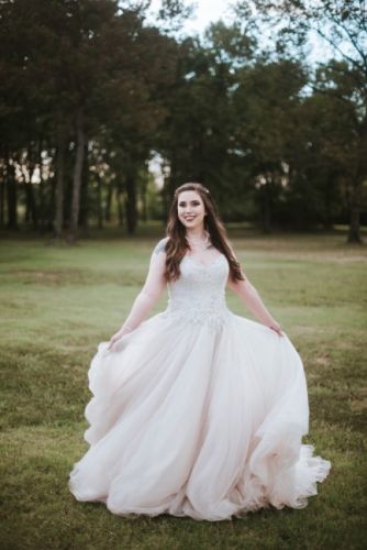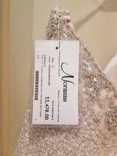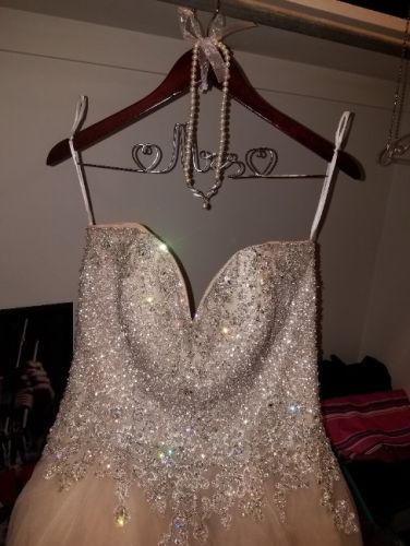 Gorgeous champagne ballgown with crystal beaded sweetheart neckline. Strapless but comes with straps that can be attached (must be sewn in). Size 14 with 4 inches taken in on the waist. It would fit a 12/14. Worn once and has been stored hanging in the protective cover since.