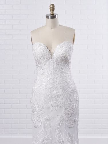 Lovely lace motifs swirl over tulle in this relaxed fit-and-flare wedding dress, featuring a strapless sweetheart neckline with subtle illusion detail. Finished with covered buttons over zipper and inner corset closure.