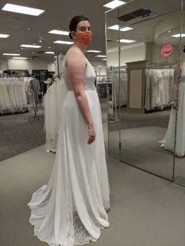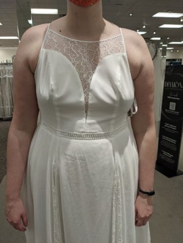 A light simple yet elegant wedding dress. With triangular segments of lace sewn into the skirt. Lace back with white fabric buttons. Triangle shaped dress. Beautiful little embroidered part sewn around the middle. Lace on back with spaghetti straps.