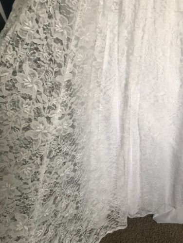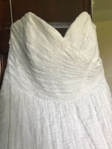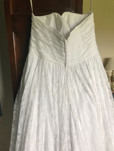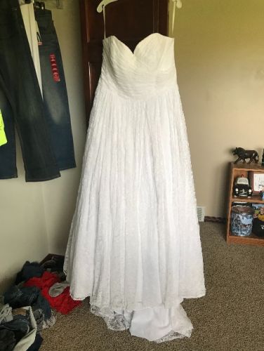 Davids Bridal Style: 9WG3829. Completely unaltered size 18 White lace Sweetheart Ball Gown (WITH POCKETS!!), only worn to try on at time of order. The pictures of me in the dress were at David's Bridal trying on their sample and I special ordered this one. Tags were removed at some point and unfortunately I no longer have them. I had bought this for my wedding in summer of 2019, but life had other plans for us and we had to pare down our wedding. I fell in love with this dress the first time I tried it on and had hoped that we would be able to do the bigger wedding later, but then 2020 happened and its time for me to find a new home for this beautiful dress. I've had it stored in a dressmakers bag in a closet since I picked it up from David's and only took it out for the pictures. I originally paid $800, asking $600.00 plus shipping or best offer.