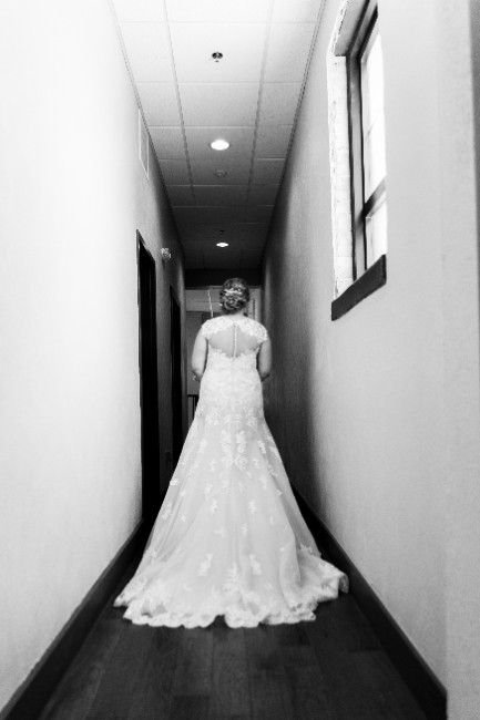 Bought as size 24, alterations to bring it in (recently wore a size 16 morilee bridesmaid dress), bra cups sewn in, shortened to 5'8 with 4"heels, shortened straps. bustle added.