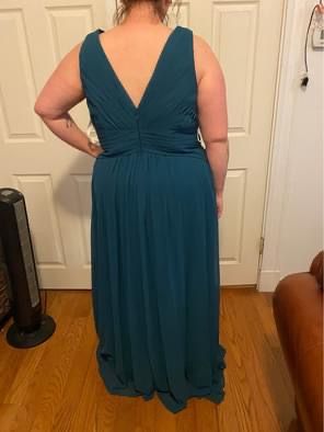 The dress is brand new, never worn (no alterations), originally $120. I am a size 12/14 but ordered a size 18 according to the measurements listed on the size chart. The bodice of the dress is fitted but also light weight and flowy. I wore the same dress in a different color and found it to be great dress to dance in! The color is listed as peacock and it’s even prettier in person.