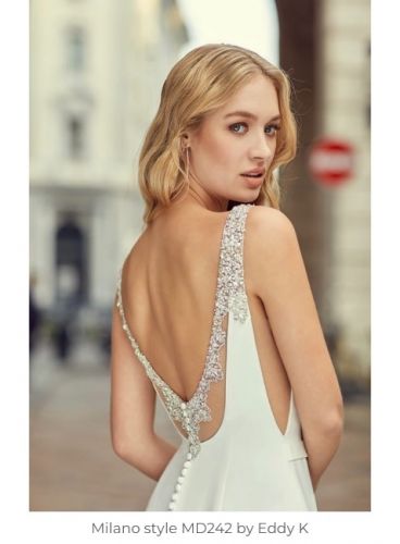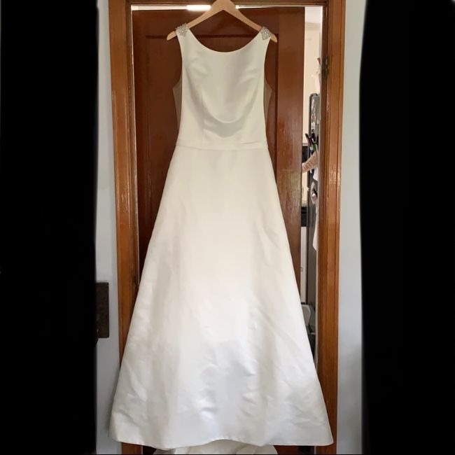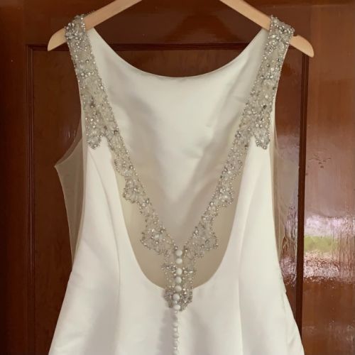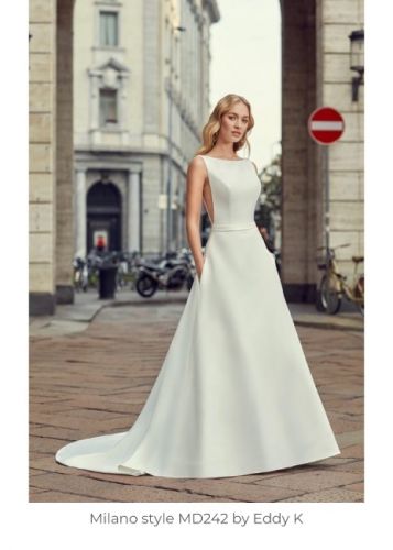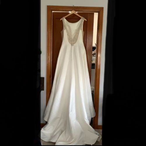 Eddy K Italia wedding dress- sheer sides, open back, beaded straps, and pockets. Satin material. Size bridal 14 (runs small, likely best for normal day size 10- I recommend getting measured to determine your bridal size before purchasing.) Originally $1400.