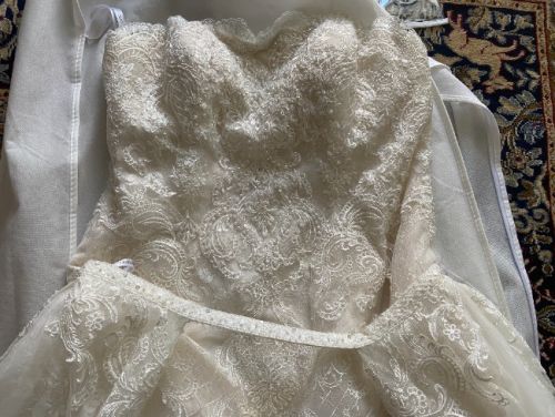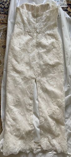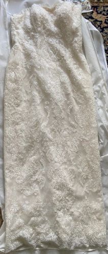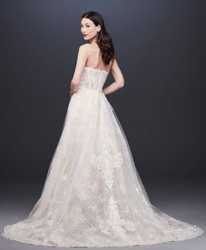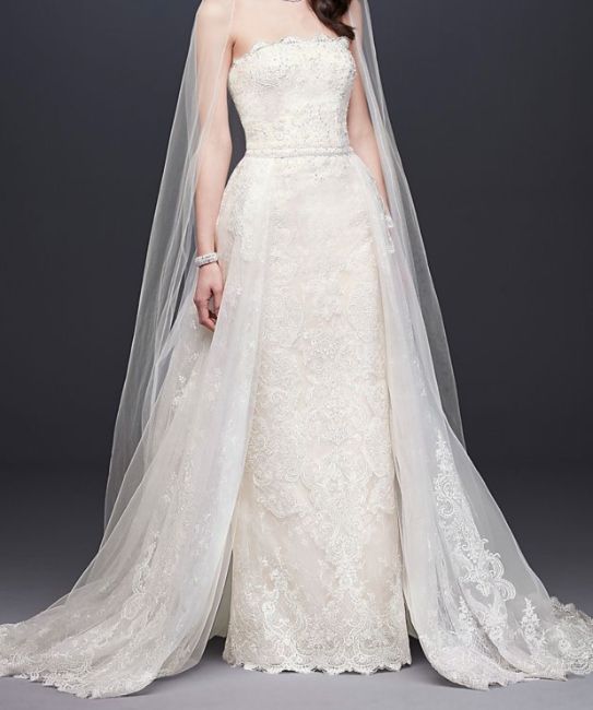 This strapless dress is ivory in color, beaded and laced. Note that the back of the dress has a slit. The dress comes with a lace, tulle overskirt that trails. Originally from David's Bridal.