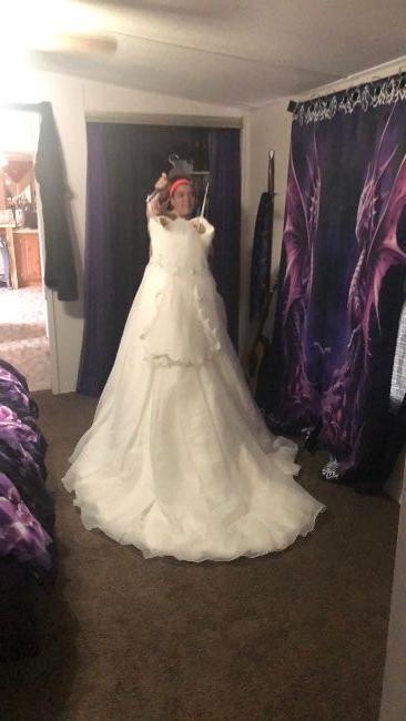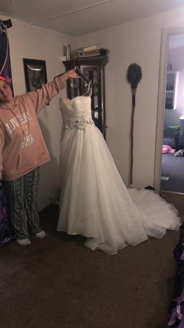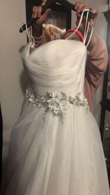 Used once price tag not on it but itâs clean no tears or damage .. and a small stain under the train on inside of dress ... dress cost 2700$ Iâm asking 500$