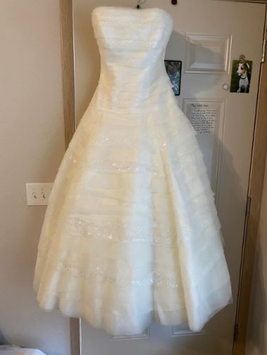 Worn once and has been kept in bridal bag since. I only have 2 pictures but if interested text the number shown and I can send you a video that shows a little more detail. Only texts will get my attention, I do not answer unknown numbers.