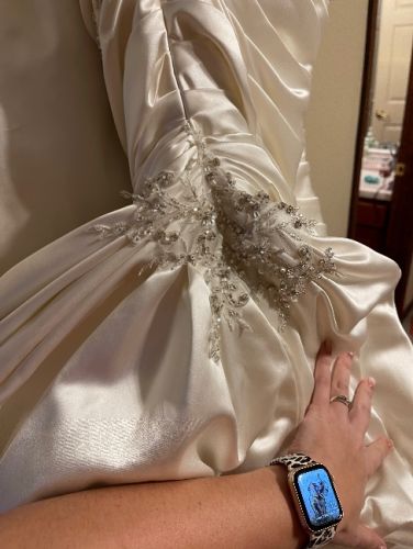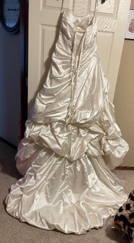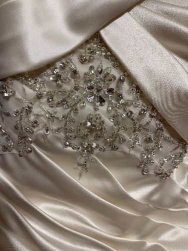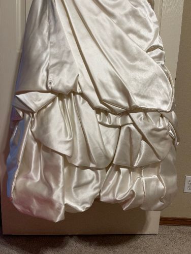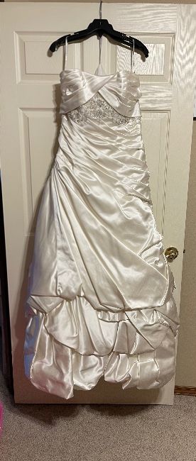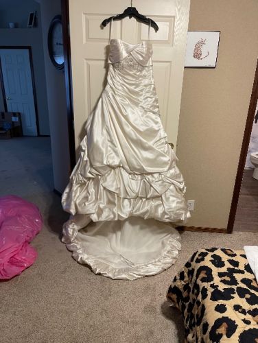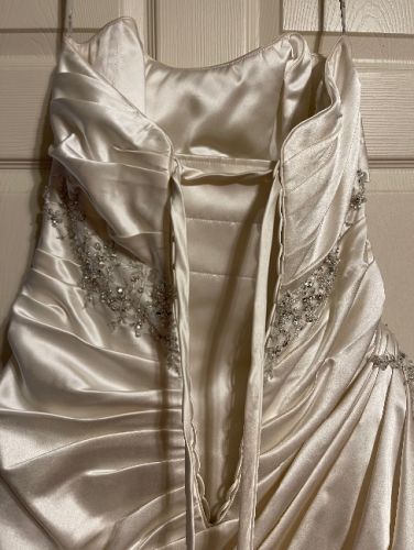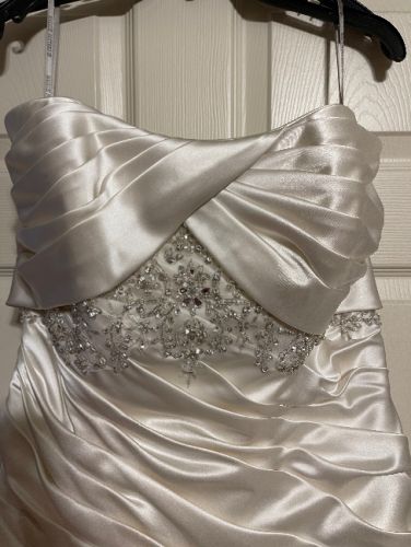 I bought this dress in 2013 for my wedding. I literally only wore it for the wedding (20 minutes). It has beautiful beading on the front and back top of the dress with an A Symmetrical waist line, also with beautiful beading.