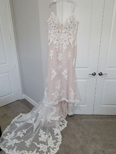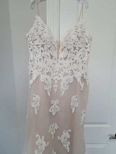 Maggie Sottero "Tuscany Royale" bridal dress. Sheath silhouette with gorgeous train. Ivory over blush, giving a nude illusion. Beaded spaghetti straps and a plunging v-neck. Extra lace motif included for minor neckline alterations or to add for modesty.