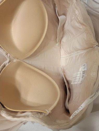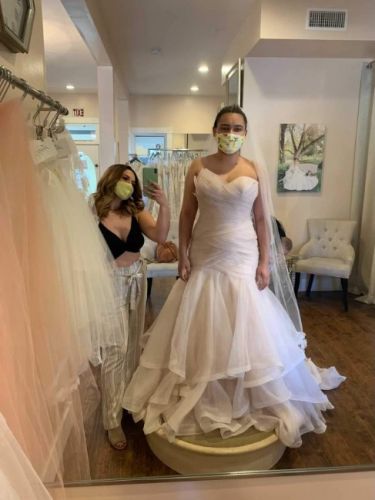 This is a size 12 mermaid light blush wedding dress. This dress has been fixed from what the photos show. There is bustling on the dress to make the train shorter. I never wore this dress and this has never been dry cleaned. Just has been altered to fit me.