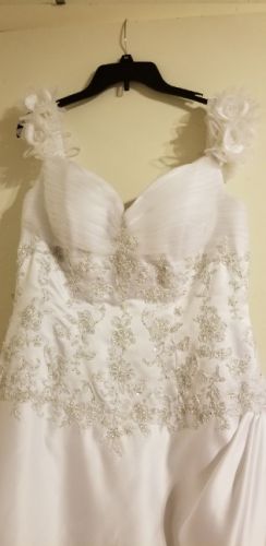 There are beautiful delicate roses on the straps that can stay on the shoulders or be draped off. The bodice has tulle that covers the chest area with the rest of the bodice having exquisite embroidering designed with beads. The ballgown skirt of the gown has a soft front panel with a tulle insert that also has the same embroidering/bead design. The back of the gown has a corset backing with a beautiful cathedral train with same embroidering/bead design near the bottom of the train. It has been altered in the length. Comes with garment bag.