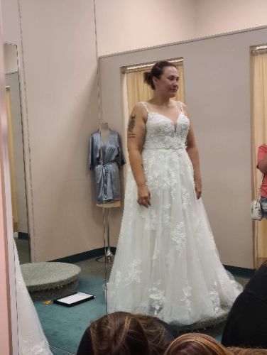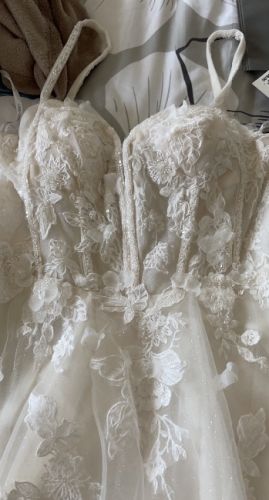 I am selling my Beautiful Wedding Dress with Vail and Heels. Beautiful Flower Details all over carrying through to the Vail.