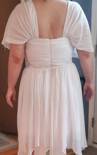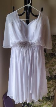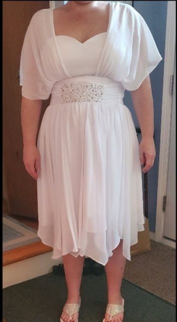 Custom-made modern wedding dress. Approximately size 12/14. Bust 44, waist 37, hips 42. Empire waist with sequins. Midi, 3/4 length. No rips or stains. Paid $200. Asking $150. No checks.