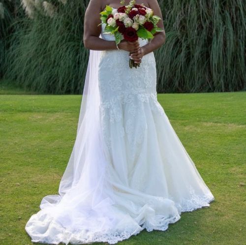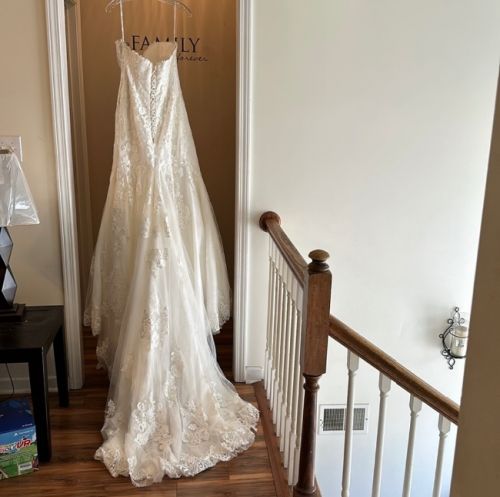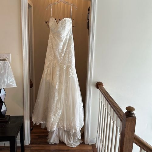 A Slightly sweetheart neckline, complete with scalloped edge, frames the face effortlessly, while the lace continues down the fitted bodice and flared skirt. Large scale lacework is placed throughout the skirt and train.