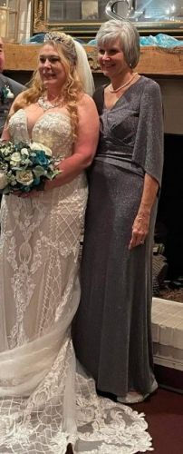 Beautiful beaded, lace scroll mermaid wedding dress.