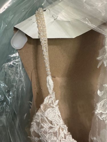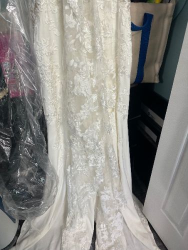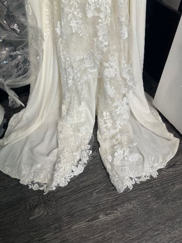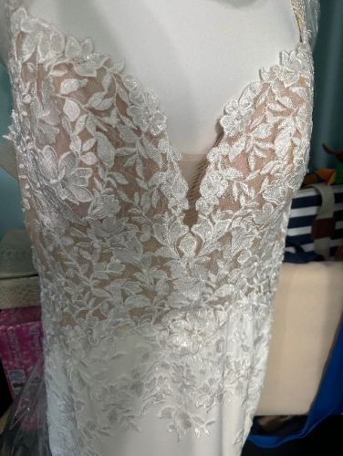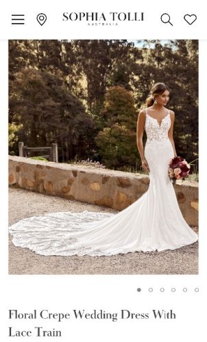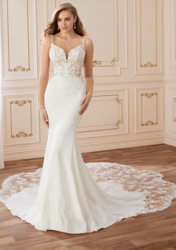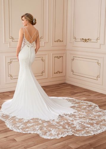 Dreamy yet dramatic, this breathtaking crepe wedding dress is unlike no other. A combination of Chantilly lace and floral lace appliqués, the semi-sheer bodice is beaming with texture and dimension. Exquisite hand beading gives the flattering V-neckline a stunning sparkle, leading into double beaded spaghetti straps which criss-cross at the back for a modern twist. Lace is artfully placed to contour every curve, trailing onto the front of the softly flared skirt. The perfect finishing touch - and the highlight of this gown - is the laser cut petal-shaped lace train.